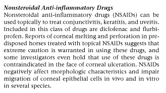 Posted on Friday, Sep 10, 2010 - 8:00 am: My above comment is not based on clinical experience Ann but research of the scientific and medical literature. I rarely use NSAID opthalmic ointments. If I feel NSAID therapy is indicated for a eye problem I use it systemically to get a little better coverage.The page comment is interesting and I will continue to research this as I do not find scientific evidence to support the idea that NSAID's should be avoided because of a primary severe corneal ulceration. I am uncertain what they mean by "predisposed horses" but if they mean those with preexisting corneal ulcers this caveat would apply equally well with steroid treatment. DrO |