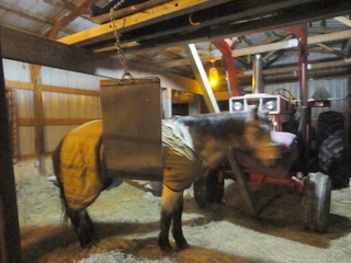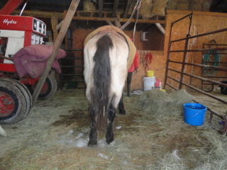 Posted on Saturday, Mar 12, 2011 - 1:40 pm: Well, now I need more advice. Dusty made it through the night. He is still in the sling. It is not holding him up, it hangs down about 4inches below his belly in case he looses his balance. I talked to the vet again today, he said without doing a lot of tests etc. His gut feeling is that he is old, arthritic, and wore himself out, especially after the fall on the ice.He is supporting himself, stretched out to pee while I was there. He is eating, drinking moderately, He is not a big drinker. We took the sling off and tried to get him to take a few steps, he was still wobbly, and I was worried he might go down again. I called an alternative medicine horse vet friends have used. He feels that he probably wore himself out, and suggested leaving him in the sling for a few days, amping up his grain and getting him some energy. We do not have any other vets to come consult. My trusty horse vet is 2 hours away and He would not make that trip. Up until he fell on the ice he has been the herd boss, running around and feeling great. He was walking stiffly on the back legs after the fall, but behaving normally otherwise. Dr. O, is there anything I can physically do to check him? Would linimint on his joints be helpful/harmful? Is there a down side to being in this sling too long? Here are a few pics of his back end, etc. He is walking around in the sling, although the sound the chain rubbing on the tractors scares him a bit.
