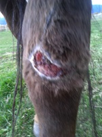 Posted on Friday, Sep 2, 2011 - 11:00 am: Suzanne, thanks for posting this. Pretty amazing to see the progression. I have fortunately never had to deal with any wound of this magnitude, but - one never knows ...Was your horse lame? Lilo |