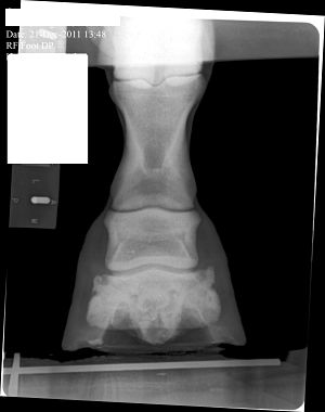 Posted on Friday, Jan 27, 2012 - 2:44 pm: The pastern joint doesn't appear to match the angle of the coffin joint or the fetlock joint...does it?What does this suggest? What else in these X-Rays would suggest 'trouble'? Mare is three and now in corrective shoes. Medial and Lateral balance was terrible. She is in a show barn and not worked a great deal and has little turn out. Thank you everyone.