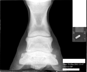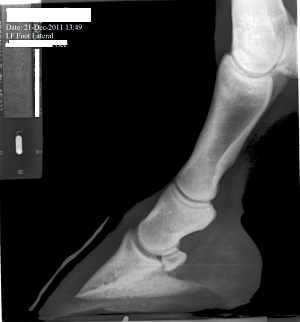 Posted on Monday, Jan 30, 2012 - 12:03 pm: Ann, look at the left lateral radiograph. The small hook at the top, lateral side of the coffin bone. It sticks up a wee bit higher than the other side and is perhaps? moving a bit past the beginning of the coffin joint. As I understand it sidebone isn't always related to a lameness issue, and many older horses have it. However, this is a 3 yr old. I "think" it is a minor issue... |