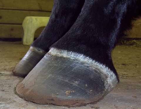 Posted on Sunday, Jan 29, 2006 - 10:26 am: Heels are definitely low and a bit run under but the medial lateral balance is still uncertain. Getting the flare out and then backing up (whether you call it squaring or rockering and rollling) the toe centered on the point of breakover just a bit more, is a stimulant for more upright heel growth. But if you can't get this corrected with trimming he may need to be shod with wedge pads.DrO |