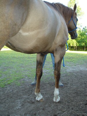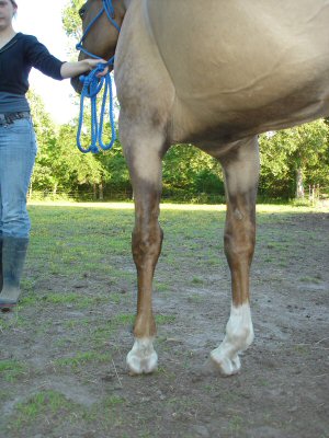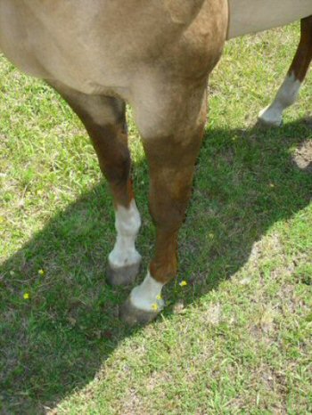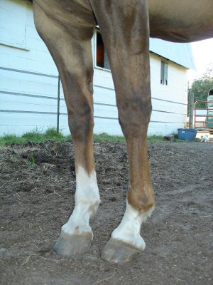 Posted on Tuesday, May 23, 2006 - 2:37 pm: I have posted below several pictures of the front legs of a 12-yo QH mare that I am boarding for an 11-yo beginner. The horse is way too much for her to handle, so the mom has decided to sell her in favor of finding something more suitable. These folks are novices and I'm trying to help them sell the mare. She has the most awkward conformation from the knees down that I've ever observed...Dr. O. or anyone who has observed this before, what is the proper terminology for this conformation and how might it affect a horse long-term? She actually moves quite well. The previous owner stated that "she was born that way, and though it was correctable when she was very young, it wasn't dealt with then." She trail rides, has a nice little jog and lope, but people are horrified by her front feet/legs. Should they be? We're only asking $1,000 for her...she's a nice little horse (needs some work as she's been in a field for several years), but those feet.... Is this type of thing as bad as it looks? She's actually got nice foundation/halter breeding....and I'd love to find her a good home with the right job...