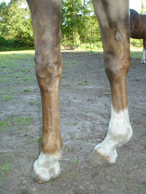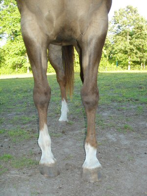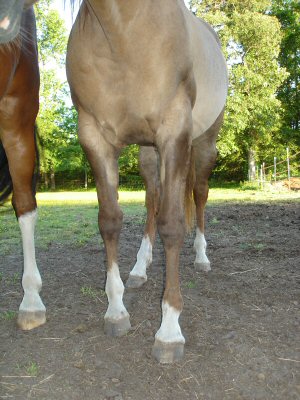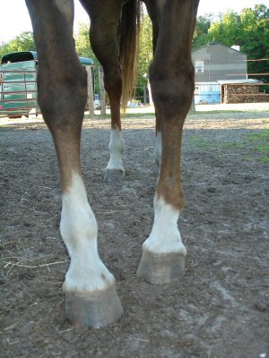 Posted on Thursday, May 25, 2006 - 8:32 am: Besides the toed in conformation from the fetlock down there is some amount of varus (inward angulation) deviation of the legs from at least the fetlock down. Together these conformational defects make arthritis of the lower legs, tendinitis of the flexors, and even navicular bone pathology more likely. This horse is best suited for light trail riding to minimize those possibilities.DrO |