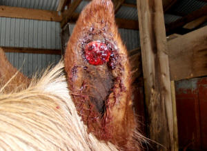Posted on Thursday, Jan 27, 2011 - 10:22 am: My beautiful mule Lily of the Valley has a walnut sized fibroblastic sarcoid on the inside of her upper right ear. The vet has recommended Xxterra Cream and I will be starting treatment today. I will be posting photos of my progress at atrailrider.com/lilyear.html. I am taking a big chance here this could go badly due to the location on the ear and drippage in to her ear causing an infection or eating away cartilage and making a hole in her ear. That along with getting her to hold still for the treatment. The vet has lots of encouragement that this should go well. Five days of cream, then leave it alone for ten days and see if another round is necessary. I am hoping the photos will help others with treatment. Open to any constructive criticism.