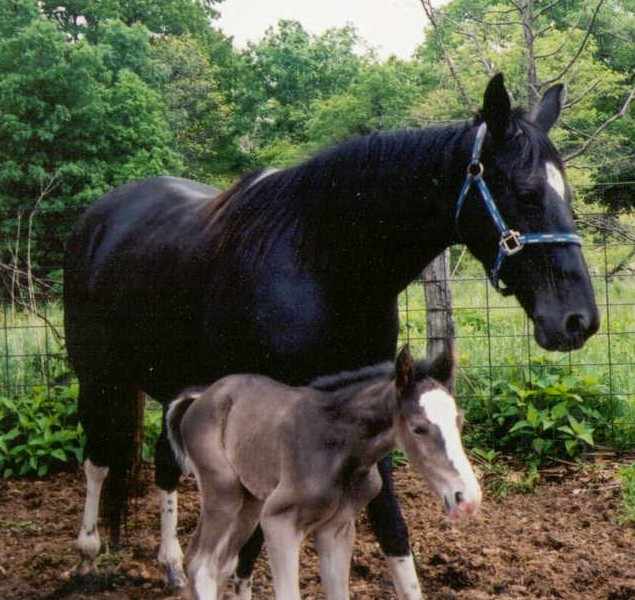 Posted on Wednesday, May 12, 2004 - 11:07 am: Sorry, I realize this thread is about grays, but since it looks like Tonya may have a black, maybe these pix will add to the discussion. It's Xena at 3 weeks, and early this spring before she shed out. The contrast between mom and filly is much greater than it appears in the second photo.![]()