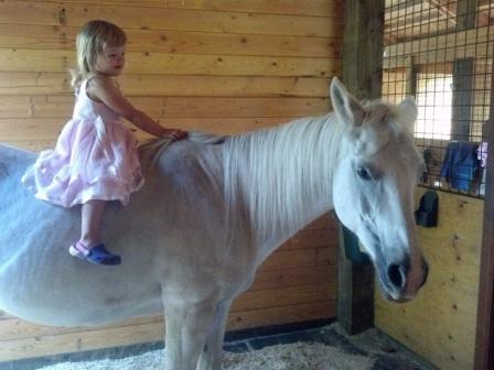 They both look so quit, like a little princess on a magic horse Helmet is always good, some people find it embarrassing (my daughter get teased a lot she is 13). If it would be me I would stick with an old mare, younger the child older the horse should be, to build a confidence and etc. You probably can try bare back saddle they have a handle up front to hold on to and you can get buddy stirrups. It’s good to start riding bare back to build a sit. We used to give lessons to a 3.5 year old girl, her favorite part was bareback riding, and she really loved it. Good luck. The baby is adorable.